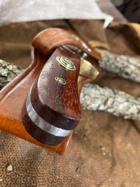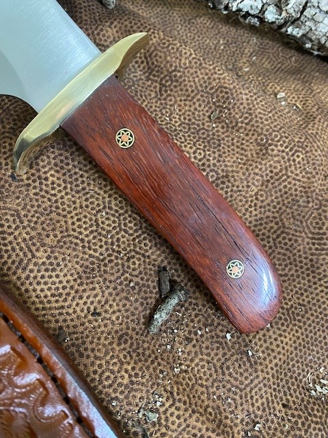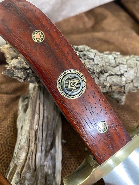 · Handle: Exotic wood Patagonian Rosewood is native to South America (Paraguay, Argentina, Brazil, and Bolivia); features a dramatic cinnamon-brown color with dark streaking; very dense and hard…extremely durable and harder than traditional hardwoods like Red Oak; Stained and Sealed; (2) 1/4” Personally made Mosaic Brass and Copper knife Pins. A Masonic Square & Compasses emblem is embedded in the handle for a distinguished look for the Mason.