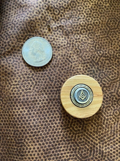 The embedded Masonic Square & Compasses emblem is the same as I use on my knives. Token Diameter: 1-1/4″; Thickness: between 5/16″ and 3/8″. Unstained. Buffed to a shine.