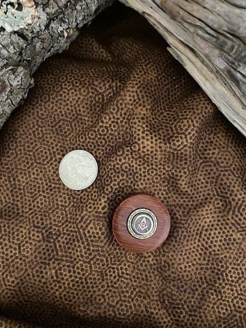 The embedded Masonic Square & Compasses emblem is the same as I use on my knives. Token Diameter: 1-1/4″; Thickness: between 5/16″ and 3/8″. Unstained. Buffed to a shine.