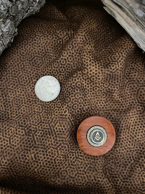 The embedded Masonic Square & Compasses emblem is the same as I use on my knives. Token Diameter: 1-1/4″; Thickness: between 5/16″ and 3/8″. Unstained. Buffed to a shine.