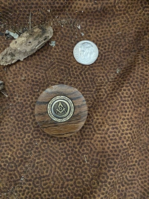 The embedded Masonic Square & Compasses emblem is the same as I use on my knives. Token Diameter: 1-1/4″; Thickness: between 5/16″ and 3/8″. Unstained. Polished.